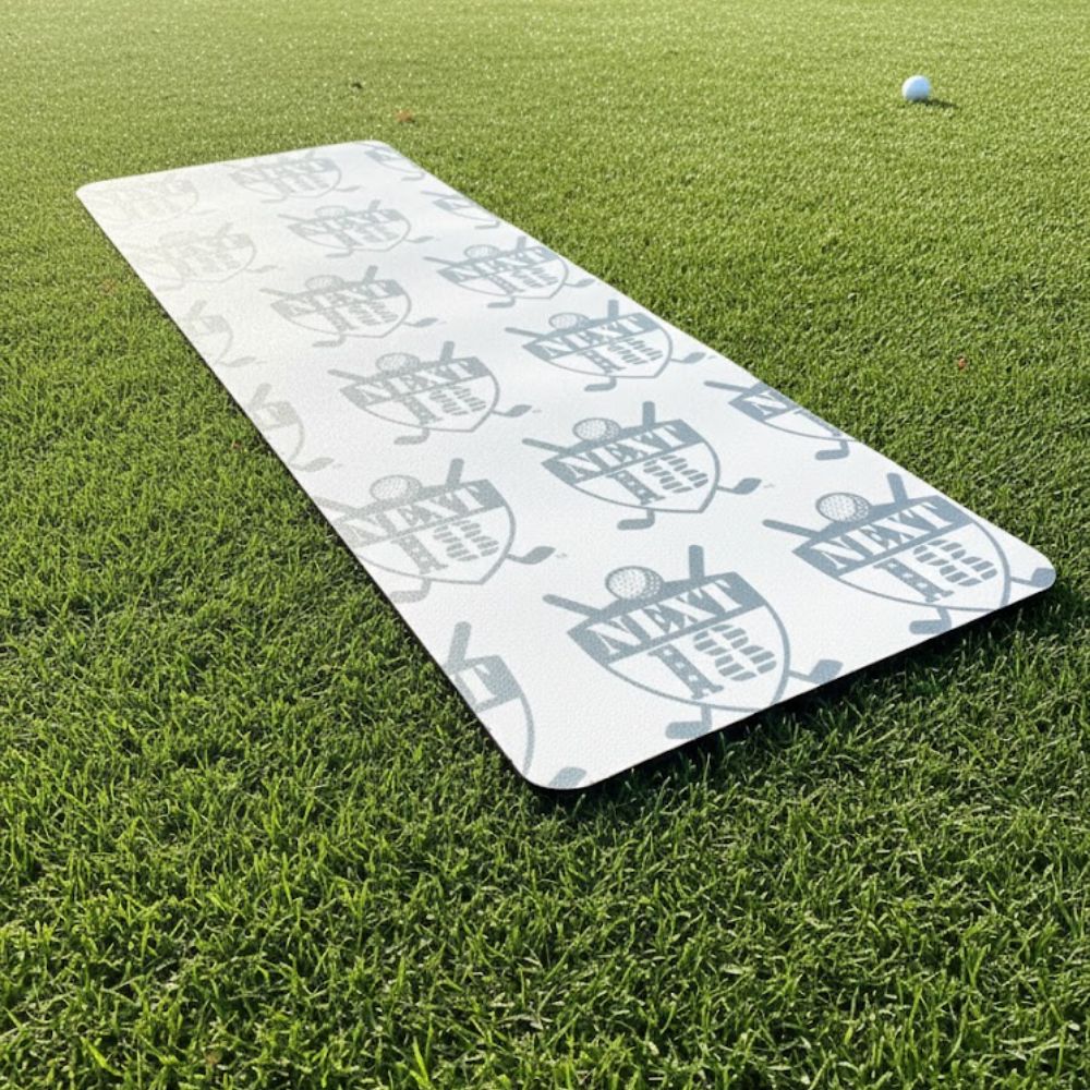 Featuring a repeating Next 18 logo pattern, this mat blends performance with mission-driven style. The textured surface enhances grip, while the durable construction lays flat on any surface—from fairway to studio floor.